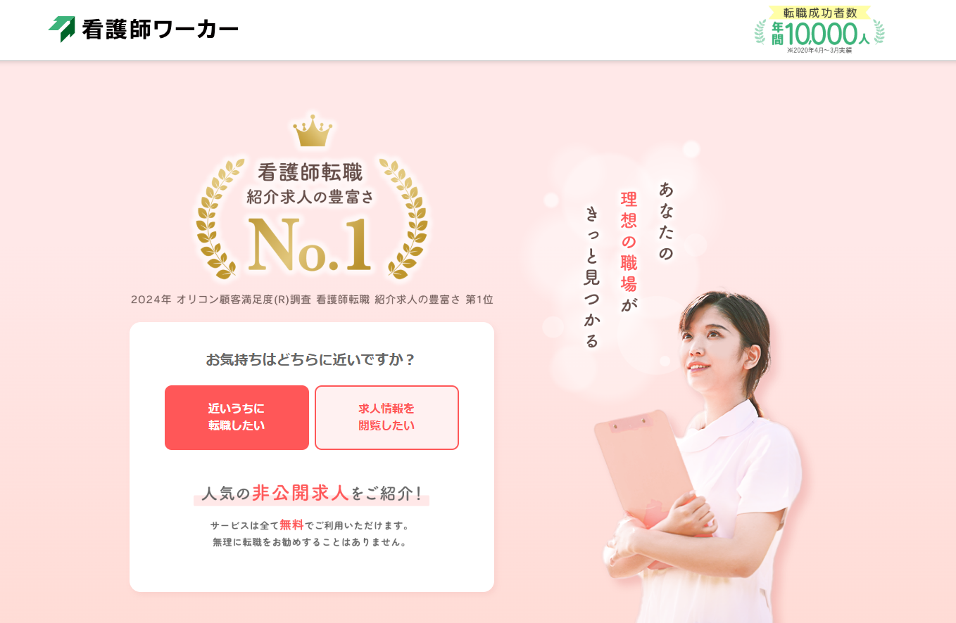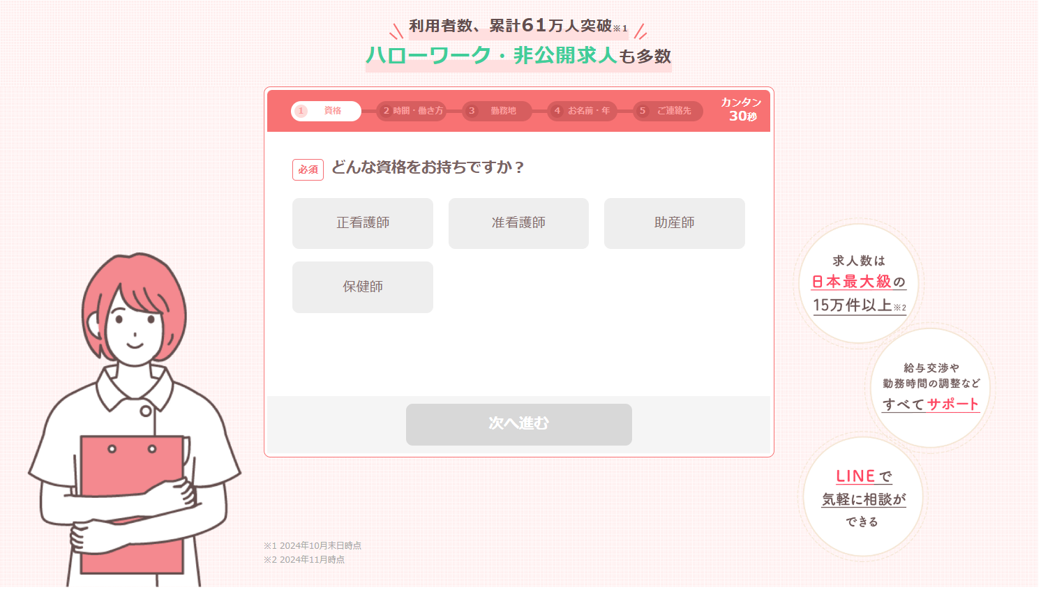 ・累計登録者数100万人(※)を超え、国内最大級の看護師さんの転職支援サービスです!※2024/3月時点
